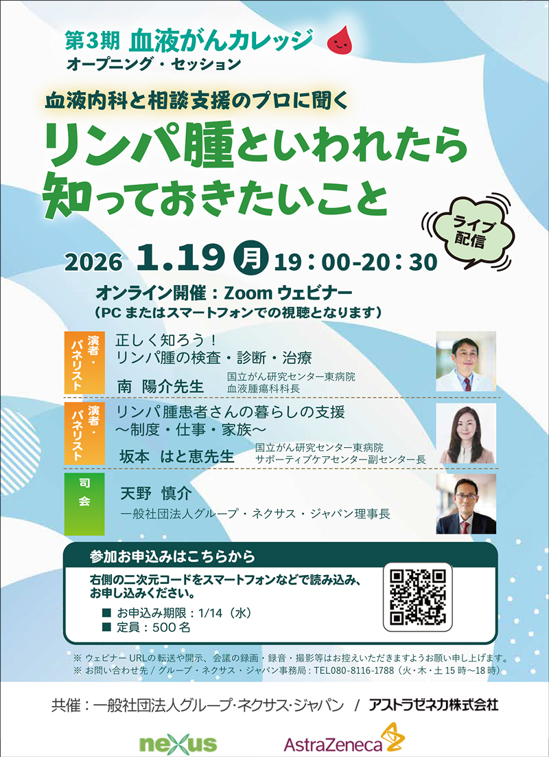 グループ・ネクサス・ジャパンが主催する「血液がんカレッジ」において、共催セッション(アストラゼネカ株式会社共催)「血液内科と相談支援のプロに聞く~リンパ腫といわれたら知っておきたいこと~」が2026年1月19日(月)19時よりライブ配信されますので、お知らせいたします。参加費は無料、事前お申込み受付中です。
